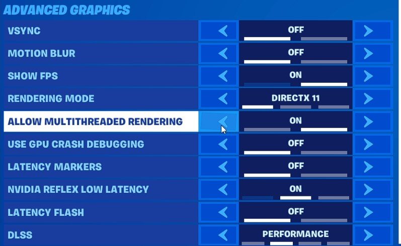 Fortnite-instellingen> Geavanceerde grafische weergave> Multithreaded rendering toestaan