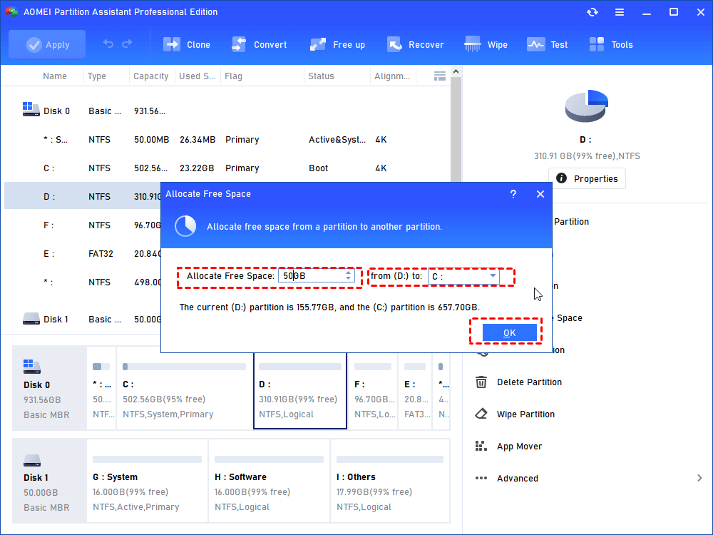 Stap 2.Stel de grootte van de toegewezen vrije ruimte en de C-schijf in en klik op "OK".