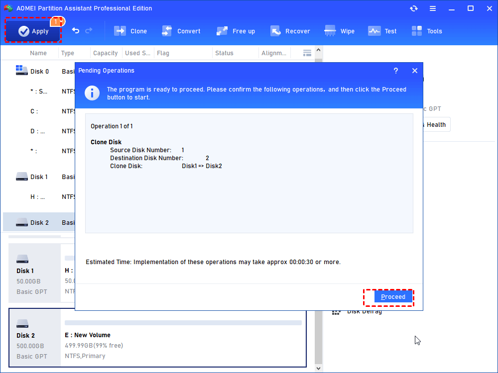 Stap 6.Klik op "Toepassen" en "Doorgaan" om de huidige schijf te upgraden. Omdat het Windows-besturingssysteem op het cd-station is opgeslagen, moet u na het klonen van de schijf van opstartstation wisselen.