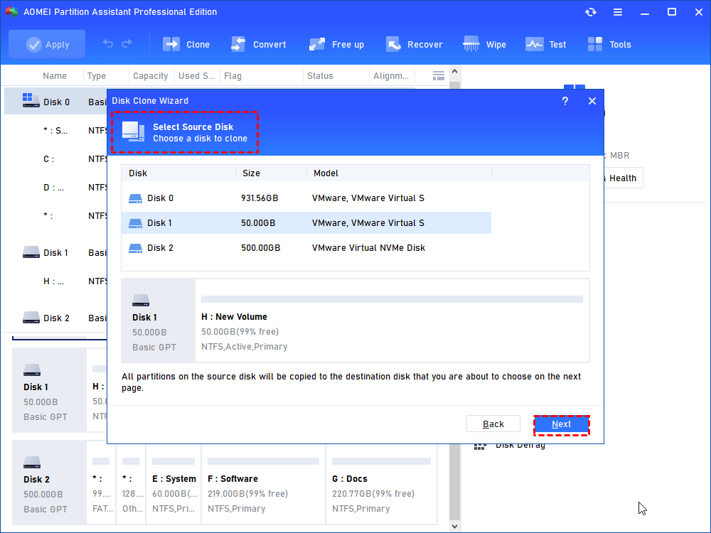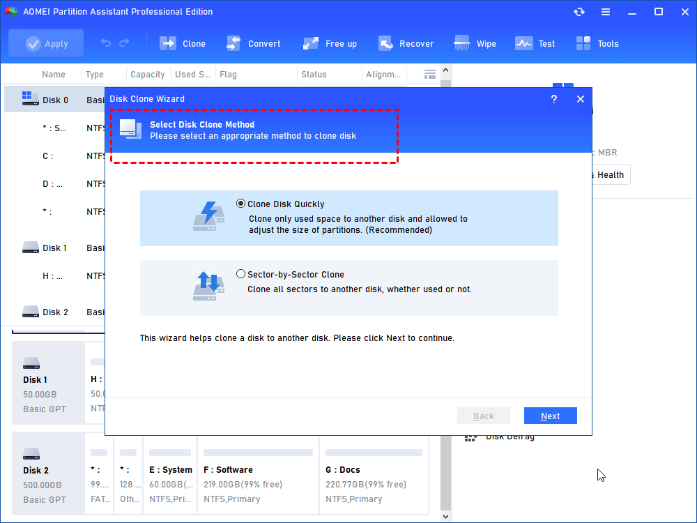 Stap 2.Er zijn twee keuzes om de huidige schijf te klonen: "Schijf snel klonen" en "Sector-voor-sector klonen". Kies nu “Schijf snel klonen”.