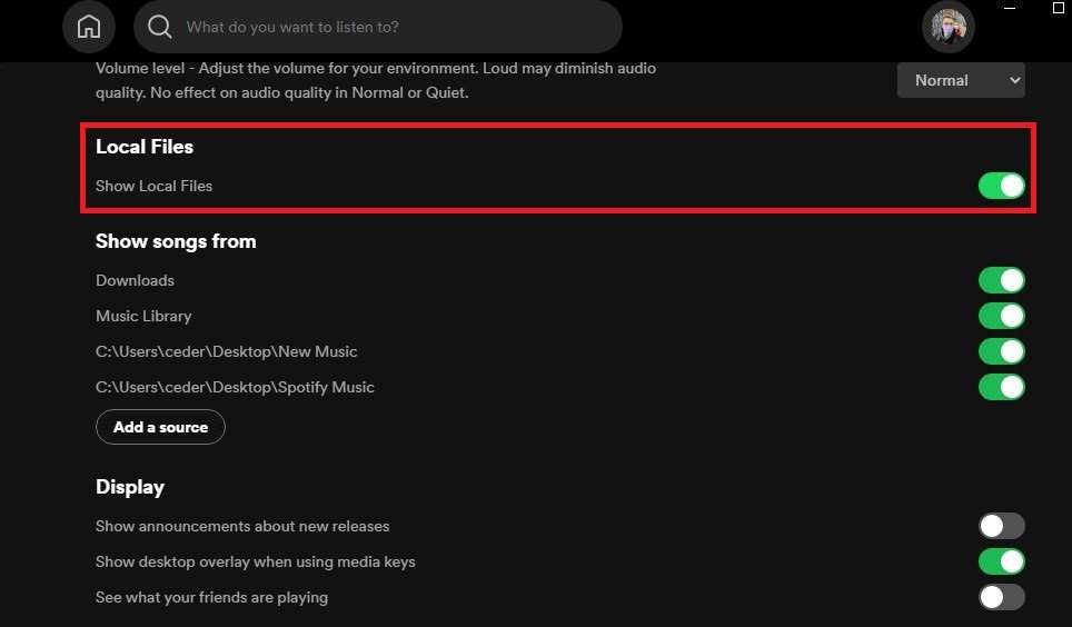 Wanneer dit is gebeurd, opent u uw Spotify-app op uw pc. Klik op uw gebruikersnaam en selecteerInstellingen. OnderLokale bestanden, zorg ervoor dat u deLokale bestanden weergevenoptie.