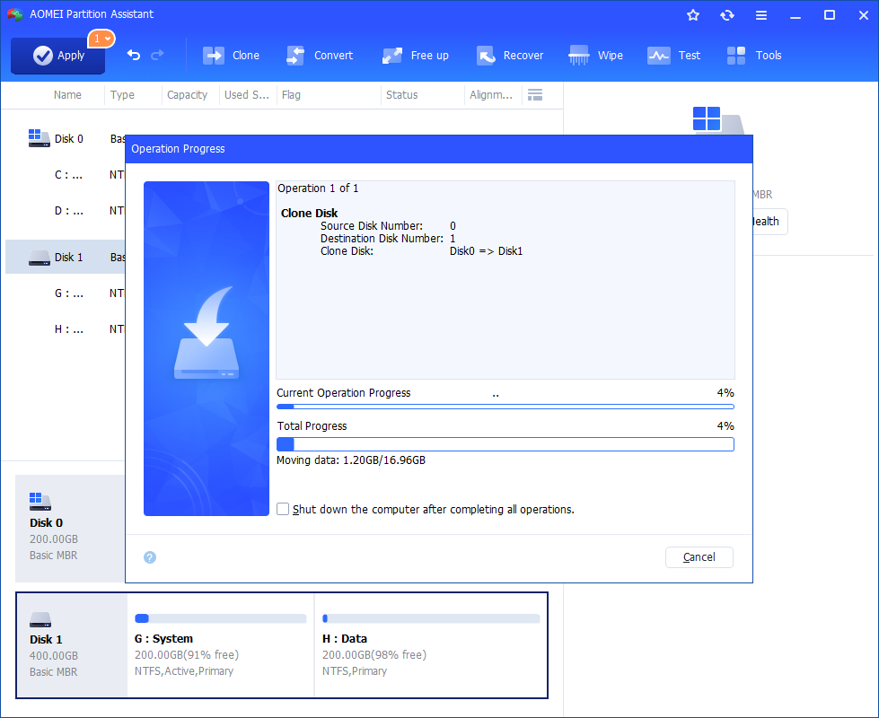 Stap 5. U kunt een voorbeeld bekijken van de werking van het klonen van de schijf door de "Pending Operations" te bekijken. Om de “Pending Operations” vast te leggen, klikt u op “Toepassen” en “Doorgaan”.