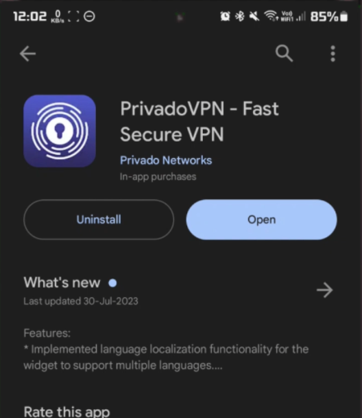 Zodra uw accountconfiguratie is voltooid, bestaat de volgende stap uit het downloaden van de PrivadoVPN-applicatie op uw Android-apparaat. Ga gewoon naar de Google Play Store, typ ‘PrivadoVPN’ in de zoekbalk en ga verder met de installatie. Na de installatie start u de applicatie en logt u in met de inloggegevens van uw nieuw aangemaakte account.