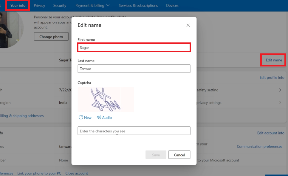 Nu u bent ingelogd, ziet u deYour infotabblad bovenaan de pagina en klik erop. Zoek en klik in het profielinformatiegebiedEdit name. Volg de eenvoudige instructies op het scherm om uw Microsoft-accountnaam te wijzigen in een nieuwe naam die u leuk vindt!
