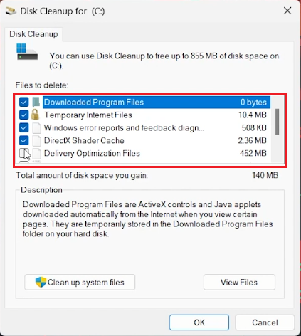 In het venster Schijfopruiming worden verschillende soorten bestanden weergegeven die u kunt verwijderen, zoals tijdelijke internetbestanden, geheugendumpbestanden met systeemfouten, enz.