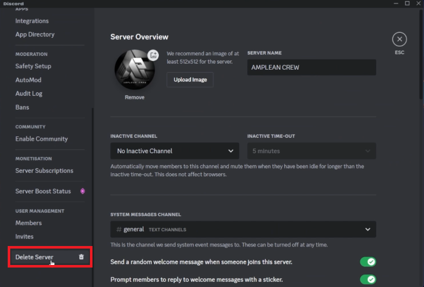 Discord Serverinstellingen > Server verwijderen