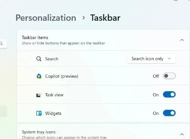 Stap 4: Zoek de optie Taakbalk en schakel de knop naast Copilot uit.