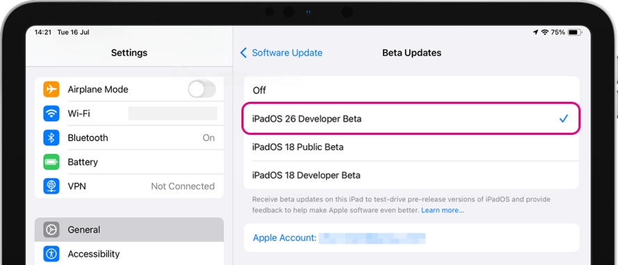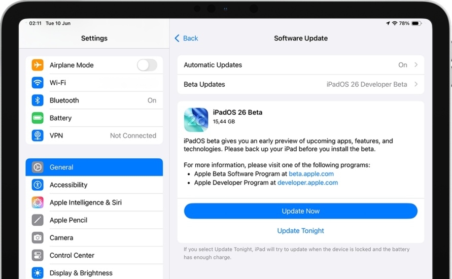 Slechts een deel van het Apple Beta Software Programma mag iPadOS 26 Beta downloaden en installeren als dit niet openbaar is. Ga naar uw iPad aanmelden voor het programma voor iPadOS 26 Beta.