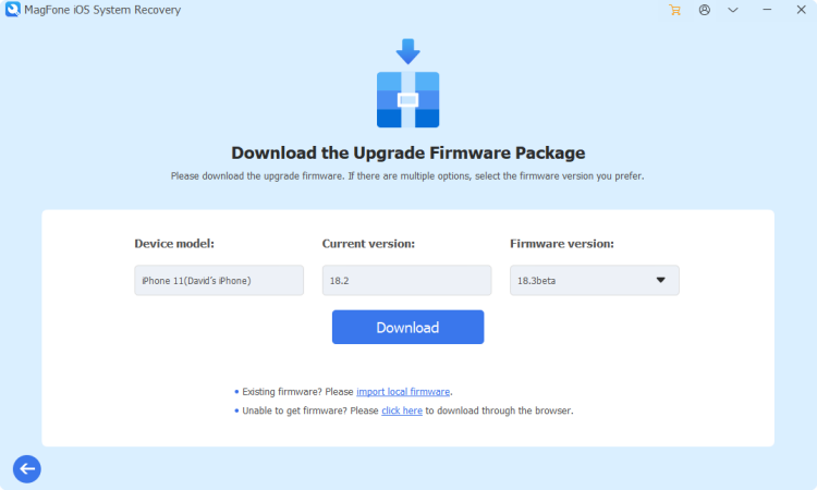 Nadat u de Explore iOS Beta Features-modus hebt geopend, gaat u naar het firmwarepakket voor uw iPad downloaden. Bekijk en controleer de apparaatinformatie die op het scherm wordt weergegeven voordat u iPadOS 26 Bèta downloadt. Klik vervolgens op de knop Downloaden om iPadOS 26 Beta te downloaden.