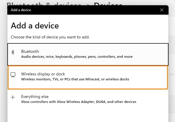 4. KlikBluetooth of ander apparaat toevoegenen klikDraadloos beeldscherm of dockvanuit een dialoogvenster op uw scherm.