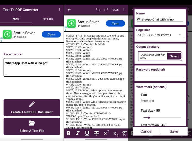 WhatsApp-chatbericht wordt standaard in TXT-formaat geëxporteerd. Met een PDF-converter kunnen gebruikers geëxporteerde WhatsApp-chats naar PDF-formaat converteren. Bovendien kunnen gebruikers een watermerk instellen om de gegevensbeveiliging te garanderen. Het tekort is dat er continu advertenties in de app staan. Hier nemen we deals voorbeeld.
