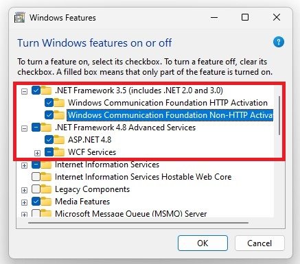 In jouwWindows-functiespaneel, zoek en vouw het uit.NET Framework 3.5En4.8 Geavanceerde diensten. Voor sommigen van jullie zullen een of twee van deze vakjes al zijn aangevinkt. Zorg ervoor dat u alle vakjes voor beide frameworks aanvinkt, waarna u dit venster kunt sluiten. Uw besturingssysteem vraagt u mogelijk uw systeem opnieuw op te starten om de functies te installeren. Nadat het systeem opnieuw is opgestart, zou de toepassingsfout moeten zijn verholpen, maar als het probleem zich blijft voordoen, raad ik u aan uw tijdelijke bestanden te verwijderen en ervoor te zorgen dat uw Windows-versie up-to-date is.