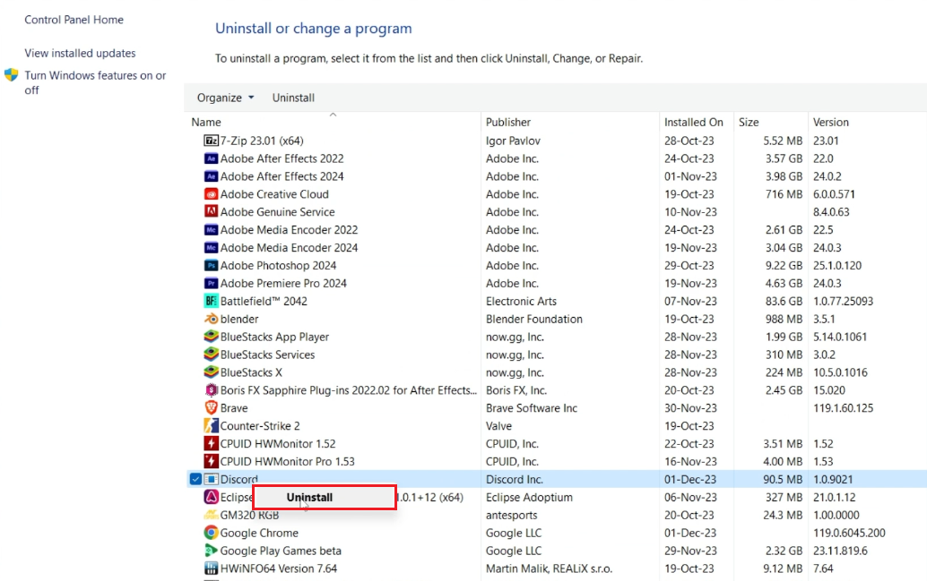 Configuratiescherm > Een programma verwijderen of wijzigen > Discord (Verwijderen)