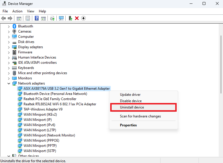 Apparaatbeheer > Netwerkadapters > Apparaat verwijderen