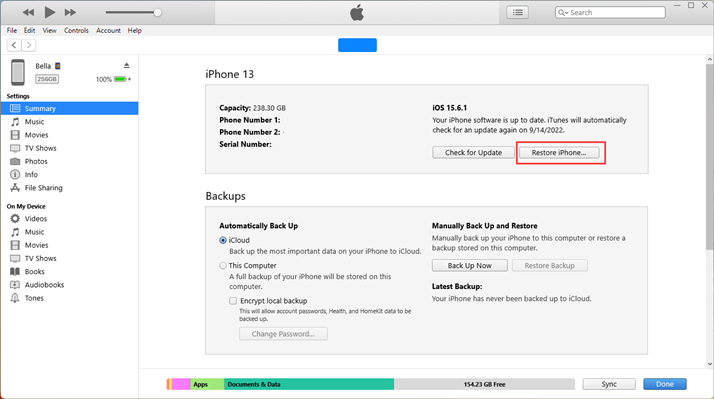 Oplossing 5. Herstel de iPhone met iTunes[Gegevensverlies]