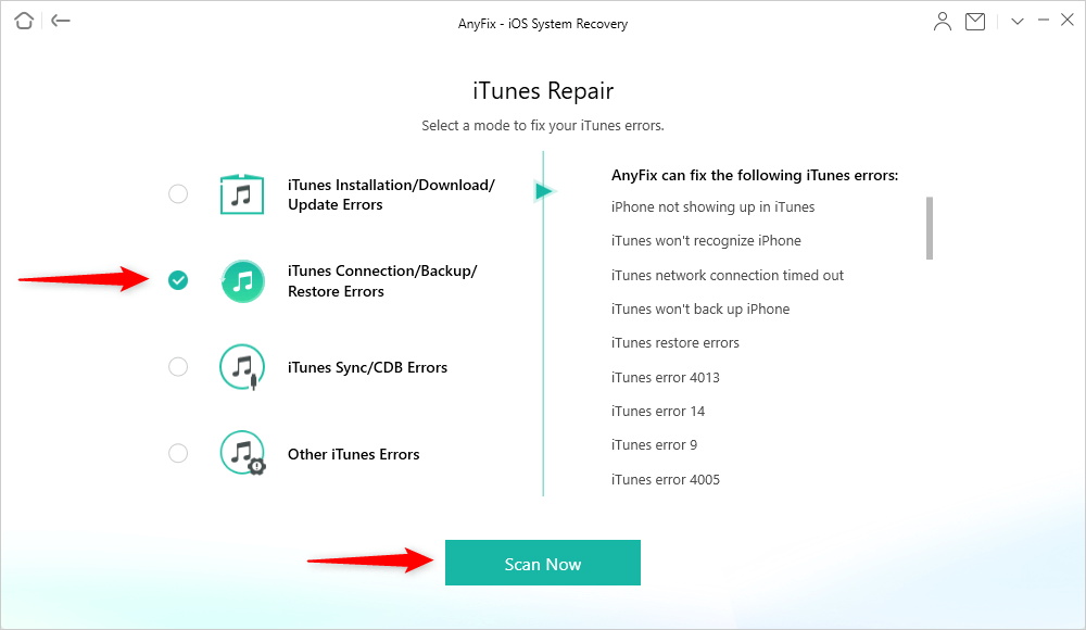 Stap 2:KiezeniTunes-verbindings-/back-up-/herstelfoutenen klikScan nu.