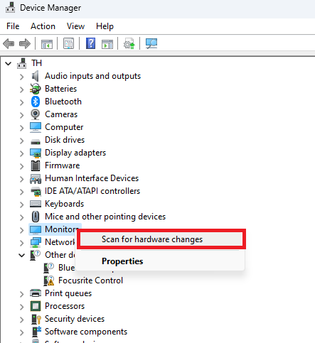 Ga verder met het openen van Apparaatbeheer om het probleem met de monitordetectie verder te onderzoeken. Klik in het venster Apparaatbeheer met de rechtermuisknop op 'Monitors' en kies 'Scannen naar hardwarewijzigingen'. Met deze actie wordt een korte scan gestart om eventuele extra monitoren te identificeren die op uw systeem zijn aangesloten.