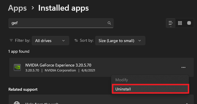 In sommige gevallen wordt de GeForce Experience-applicatie niet correct geïnstalleerd, waardoor updates van het GPU-stuurprogramma niet kunnen worden geïnstalleerd. Om softwaregerelateerde problemen op te lossen, gaat u naar uw Apps-instellingen. Navigeer naar Geïnstalleerde apps en zoek GeForce. Klik op het burgermenu voor de GeForce Experience-applicatie en klik op Verwijderen