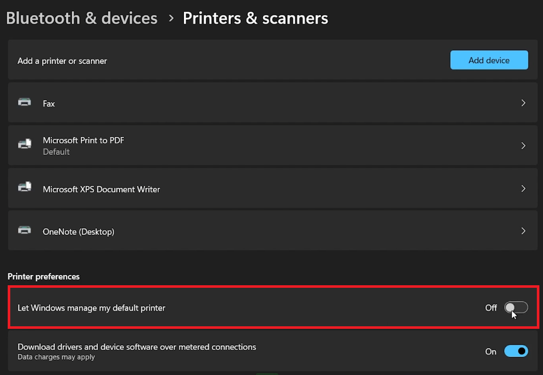 Zoek de instelling 'Laat Windows mijn standaardprinter beheren'.