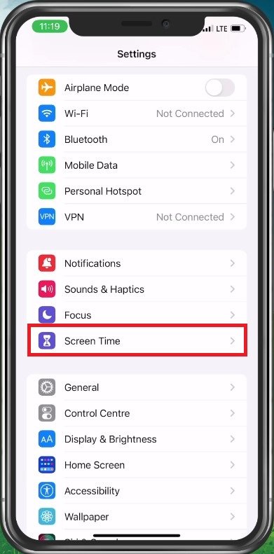 Open eerst uw iPhone-instellingen. Tik vanaf hier opSchermtijd.