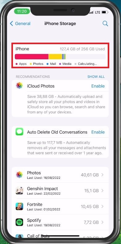 Ga vervolgens naar uwiPhone-opslaginstellingen. Het kan een paar seconden duren om uw opslaginformatie te laden en u kunt een voorbeeld bekijken of er nog opslagruimte over is voor uw schermopnamen.