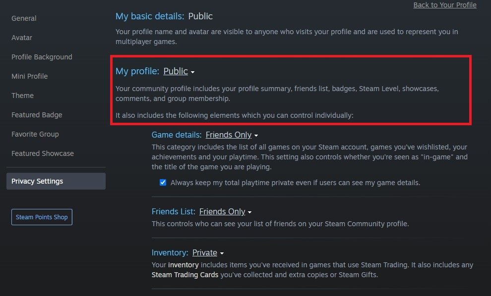 In jouwPrivacy-instellingenZorg ervoor dat uw profiel op openbaar staat. Hierdoor kunnen andere gebruikers u vinden en toevoegen. Als u niet wilt dat anderen uw gameactiviteit of inventaris zien, kunt u deze opties instellen opAlleen vriendenofPrivéonderstaand. Als dit klaar is, probeer dan opnieuw een gebruiker toe te voegen aan je Steam-launcher.