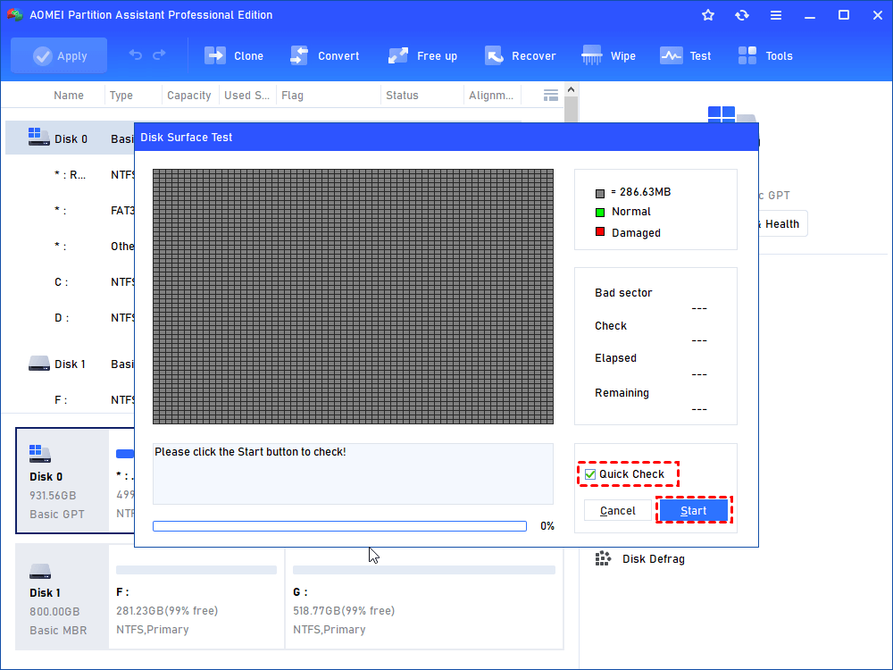 Stap 2. Klik op Start om de oppervlaktetest uit te voeren. Mogelijk wilt u Snelle controle aanvinken om een snelle test uit te voeren.