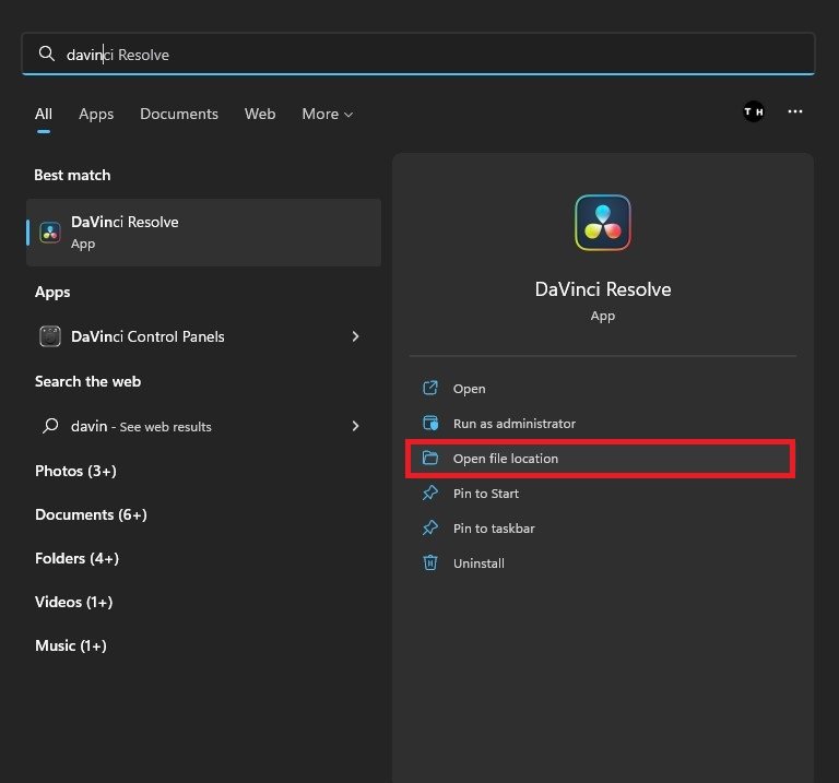 Als DaVinci Resolve niet op deze locatie is geïnstalleerd, zoek dan naar DaVinci en selecteerOpen Bestandslocatievoor de app. In de meeste gevallen zal dit de locatie zijn van de DaVinci Resolve-snelkoppeling. Klik met de rechtermuisknop op de snelkoppeling en selecteerOpen Bestandslocatienogmaals om naar de uiteindelijke installatielocatie voor deze app te gaan.