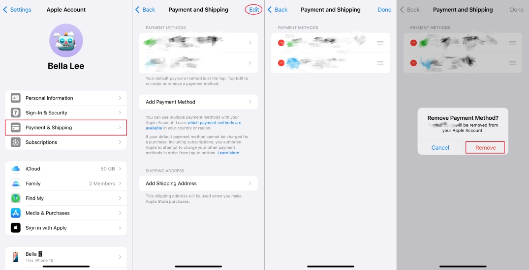 Stap 5.KlikBewerkingnaast de oude betaalmethode en klik vervolgens opBetaalmethode verwijderen.