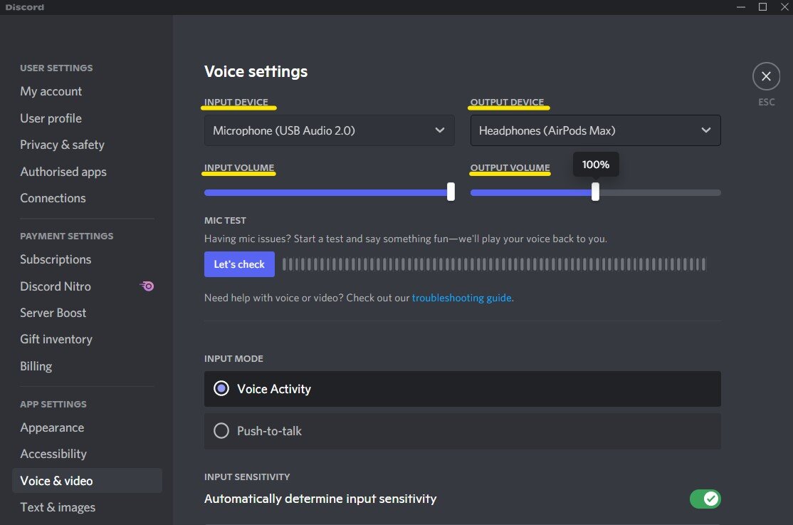 Open uw instellingen voor de applicatie die u wilt gebruiken. Voor problemen tijdens het gebruikMeningsverschil,Open bijvoorbeeld de applicatie en navigeer naar uw gebruikersinstellingen. Selecteer in uw app-instellingenSpraak en video. Met Discord kunt u, zoals bij de meeste toepassingen, uw invoer- en uitvoerapparaat wijzigen. Hieronder kunt u uw microfoon testen om te zien of uw probleem met laag volume verband houdt met de applicatie of het besturingssysteem.