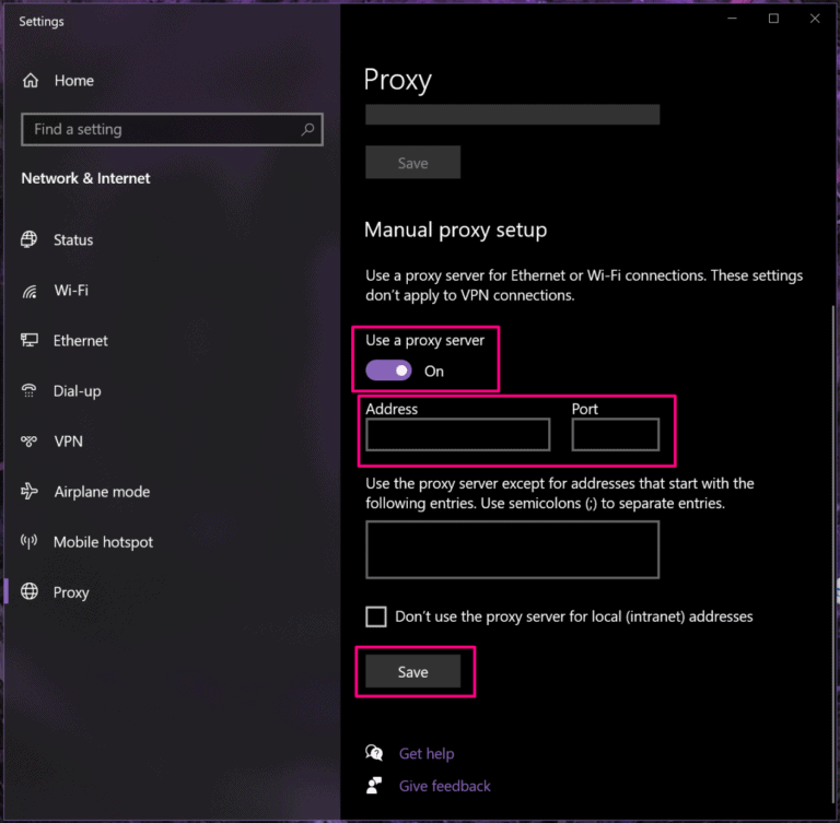 - Schakel de “Gebruik een proxyserver' schakel de balk naar rechts, zodat er 'Op.”