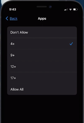 Content Restrictionsen selecteer vervolgensApps.Er zullen verschillende leeftijdscategorieën worden gepresenteerd. Kiezen bijvoorbeeld