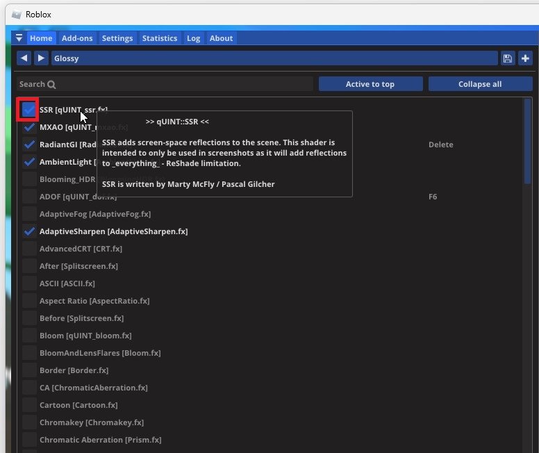 Roblox Roshade-paneel (F7)
