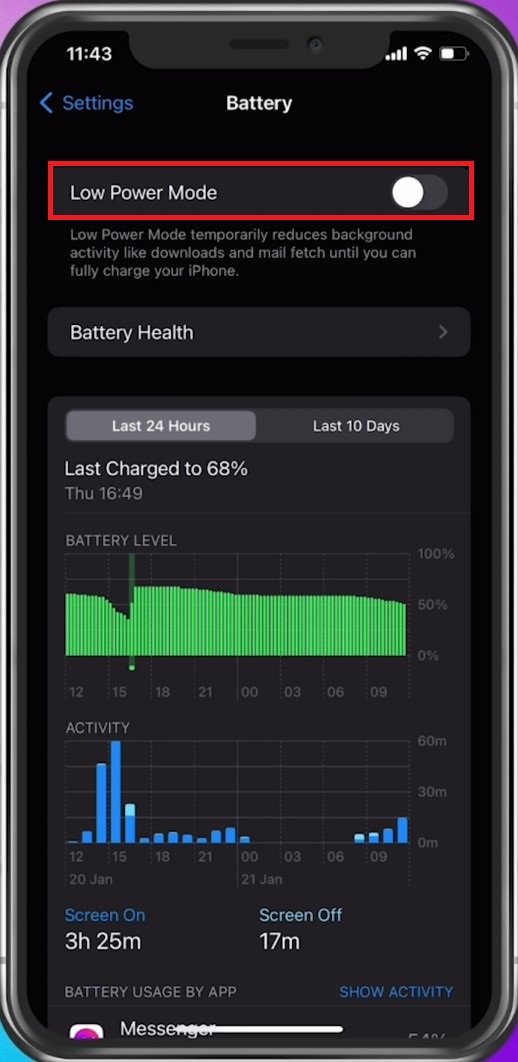 Scroll naar beneden en tik opBatterij. Zorg ervoor dat deLow Power-modusis uitgeschakeld.