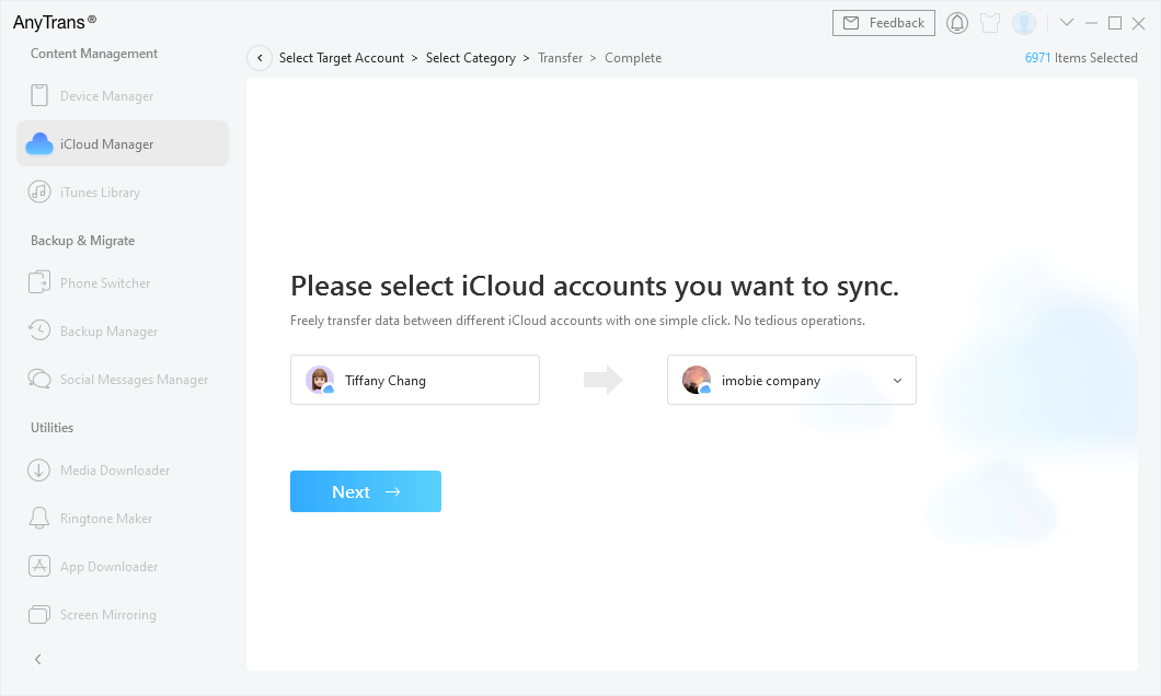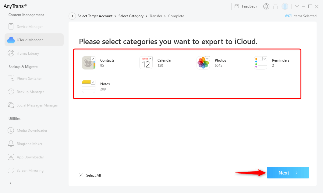 Stap 4. Selecteer Alles of kies de categorieën die u wilt overbrengen naar het doel-iCloud-account > Tik opVolgendeknop, zal AnyTrans de twee iCloud-accounts onmiddellijk samenvoegen.