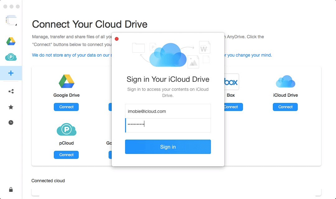 Stap 1. NuMeld u aan bij AnyDriveen voeg vervolgens meerdere iCloud-accounts samen tot één. Nadat u zich heeft aangemeld bij uw account, ziet u de volgende interface.