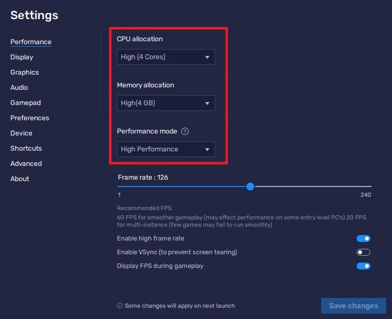 OnderPrestatiemodusZorg ervoor dat u deze optie insteltHoge prestaties. Dit kan soms de visuele kwaliteit verlagen om ervoor te zorgen dat u een betere framesnelheid kunt behouden. Ik geef er de voorkeur aan om de hoge FPS-optie in te schakelen en de framesnelheid van de emulator in te stellen volgens mijnvernieuwingsfrequentie van het scherm.