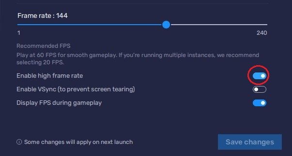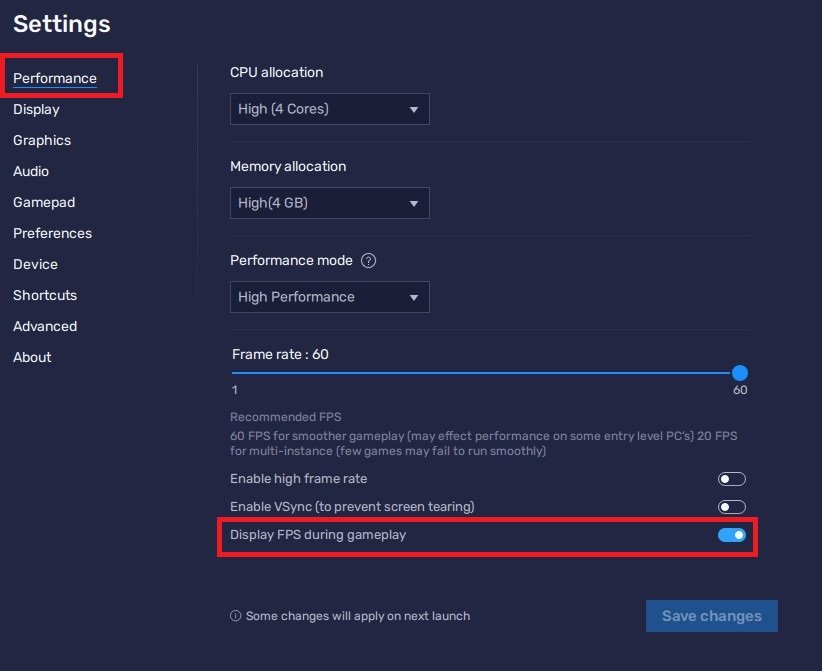 OnderPrestatiemodusZorg ervoor dat u deze optie insteltEvenwichtig. Dit vermindert het geheugen- en CPU-gebruik als uw pc achterblijft of als u op een andere manier slechte prestaties ondervindt. Ik geef er de voorkeur aan om de hoge FPS-optie in te schakelen en de framesnelheid van de emulator in te stellen volgens mijnvernieuwingsfrequentie van het scherm.