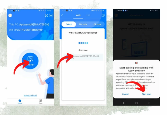 - Open de app op beide apparaten, tik op de Mirror-knop op uw telefoon, kies vervolgens uw tv uit de gegeven opties en tik vervolgens op Nu starten.