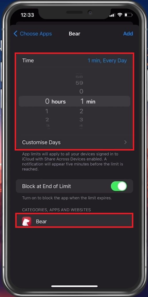 Zorg ervoor dat schermtijd is ingeschakeld. Als dit niet het geval is, moet u een toegangscode voor de schermtijd instellen. Tik opApp-limieten. SelecteerLimiet toevoegenen ga verder met het invoeren van uw toegangscode. Zoek naar 'Beer' als dit uw notitie-app is en tik opVolgende. Stel de limiet in op 1 minuut voordat u de nieuwe schermtijdlimiet toevoegt.