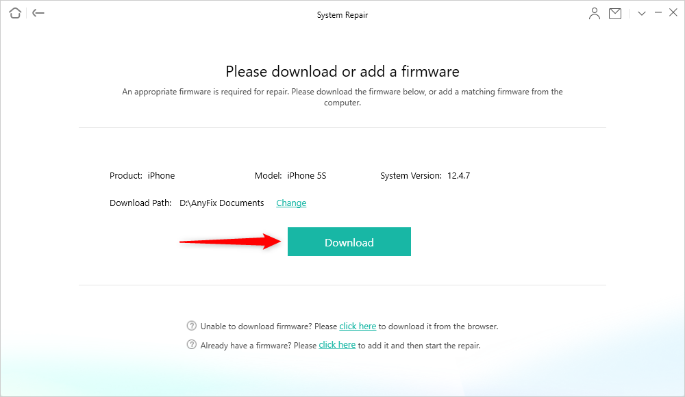 Stap 3. Controleer uw apparaatgegevens en download de reparatiefirmware. Nadat u het downloaden hebt voltooid, wacht u tot PhoneRescue voor iOS uw iPhone heeft gerepareerd.