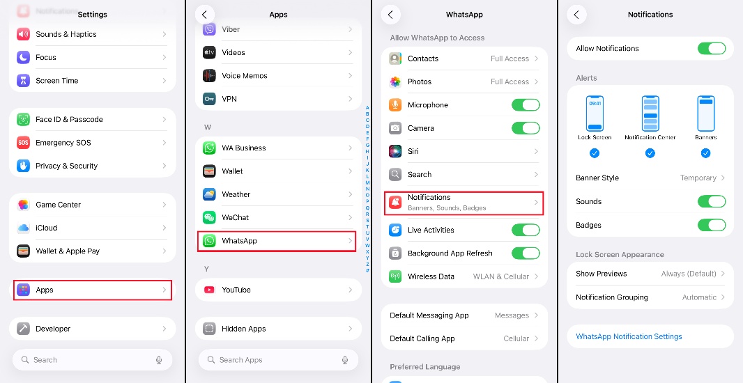 Stap 3.KraanMeldingenom WhatsApp toe te staan je meldingen te sturen en het meldingstype in te stellen. U kunt ook instellen of inhoud op het vergrendelscherm moet worden weergegeven.