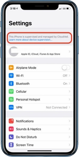 Wanneer uw iPhone of iPad is ingeschreven bij DEP, kunt u bovenaan de Instellingen het bericht Supervisie – Deze iPhone staat onder toezicht van een andere computer vinden.