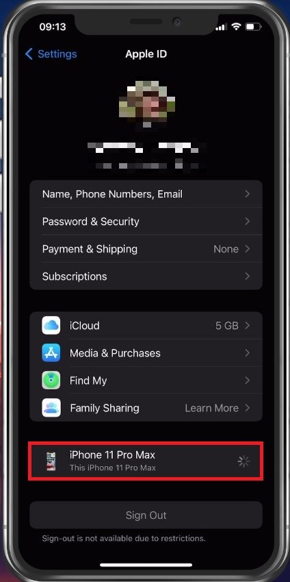 Open uw iPhone-instellingen. Tik hier op uwApple-IDnaam en zorg ervoor dat u bent ingelogd met het juiste Apple ID-account. Tik vervolgens op uw iPhone of iPad in de onderstaande apparatenlijst.