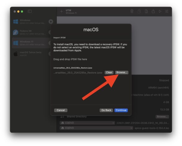 - Vervolgens moet je het IPSW-bestand voor MacOS Tahoe bèta selecteren dat je eerder hebt gedownload, dus klik op "Bladeren" en kies het UniversalMac_Restore.ipsw-afbeeldingsbestand dat zich waarschijnlijk in je map ~/Downloads bevindt