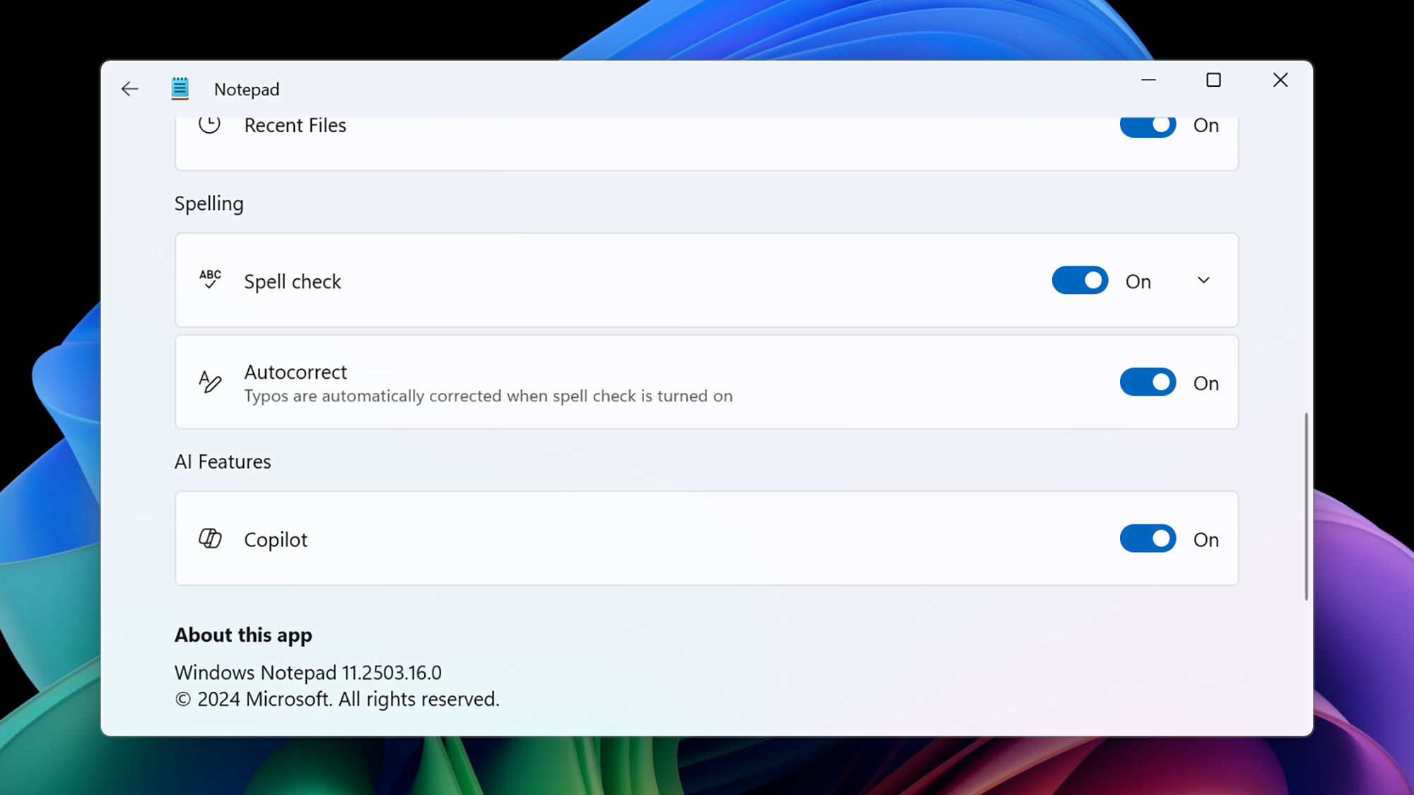 Het is je misschien opgevallen dat AI ook in Kladblok en Paint is binnengeslopen, om je te helpen bij het schrijven en maken van afbeeldingen – en de functies zijn opnieuw beschikbaar via knoppen op de werkbalken met Copilot-branding. Klik in Kladblok op het tandwielpictogram (rechtsboven) om toegang te krijgen tot de programma-instellingen en schakel vervolgens het programma uitTweede piloottuimelschakelaar om de AI-functies aan het zicht te onttrekken.