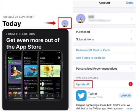 Klik op het profielpictogram in de App Store om apps bij te werken