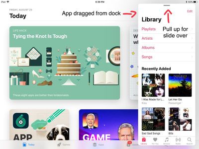 Converteer de tweede app naar een Slide Over-multitaskingvenster door bovenaan de app op de grijze lijn omhoog te vegen. Van daaruit kan de Slide Over-weergave naar een gesplitste weergave worden getrokken door de grijze balk die de twee apps naar links scheidt, te trekken. U kunt schakelen tussen Slide Over en Split View door de balk naar links of rechts te slepen.