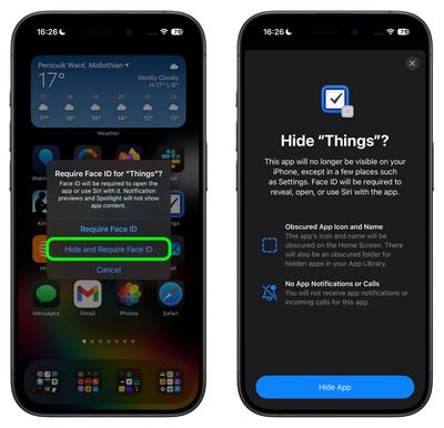 Wanneer u een app van derden vergrendelt met behulp van de bovenstaande methode, heeft u de mogelijkheid om deze ook te verbergen, maar u kunt systeemapps zoals Safari of Foto's niet verbergen. Indien ingeschakeld, worden het app-pictogram en de naam verwijderd van het startscherm en worden deze niet weergegeven in zoekopdrachten, hoewel deze mogelijk nog steeds verschijnen in de app Instellingen.