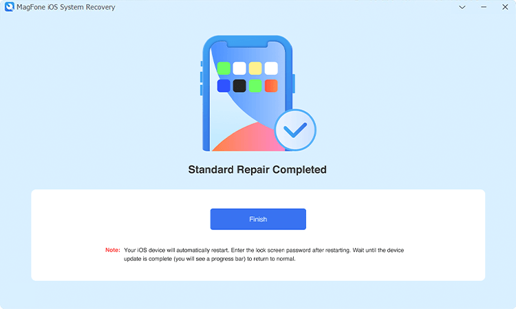 Nadat het firmwarepakket succesvol is gedownload, kunt u kiezenStandaardreparatie starten. MagFone iOS Systeemherstel zal beginnen met het oplossen van de iOS-systeemstoringen van uw iPhone. Vervolgens wordt uw iPhone-scherm na het proces normaal weergegeven.